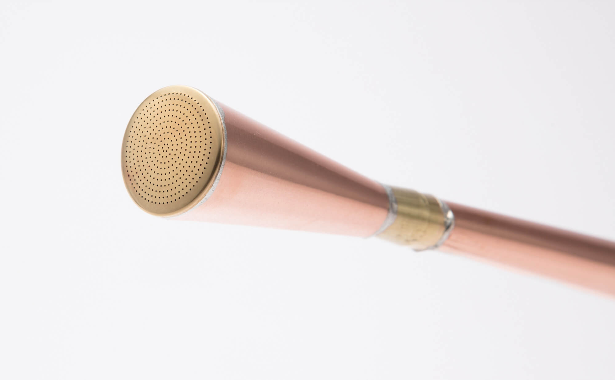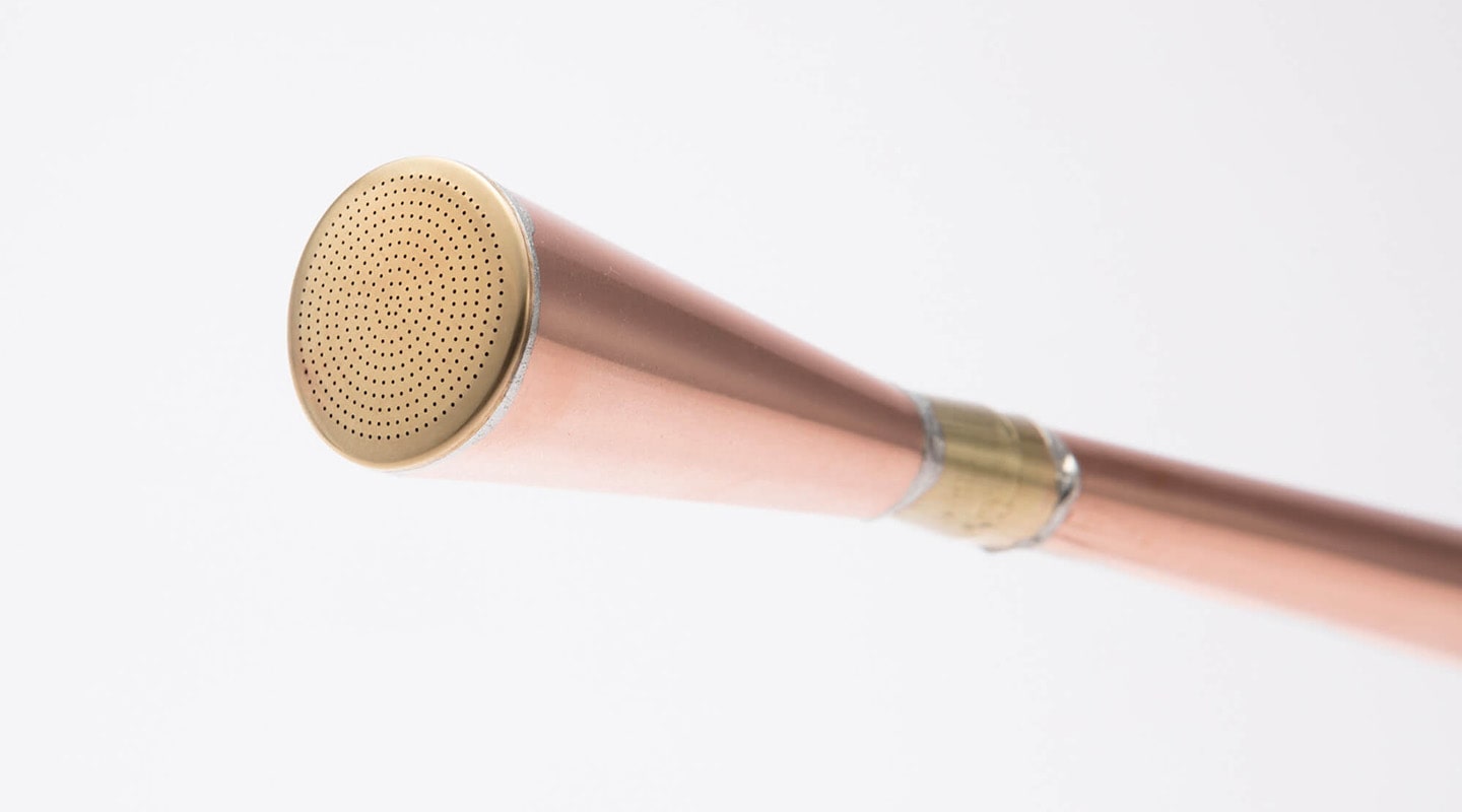 ハス口の穴が小さいほど細くて柔らかな水が出ます。小さな穴から水を出すには、高い水圧が必要です。竿を長くすることで、水圧をコントロール。一定の安定した散水を可能にしました。